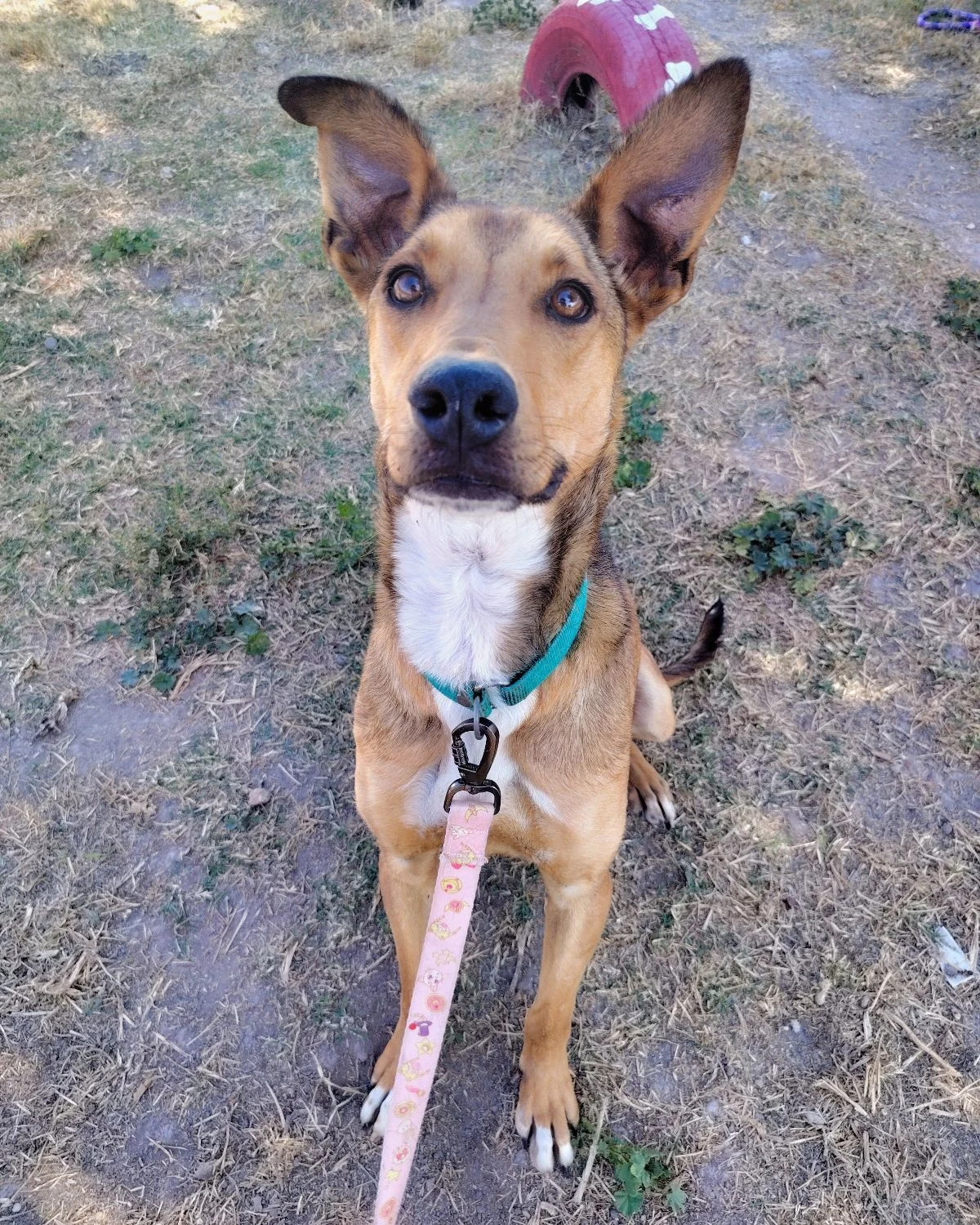 Whatever had happened before that gas station, Rey had learned not to trust easily. But the shelter changed that. He grew up there, and the dog he became tells a different story than the one he arrived with — playful, affectionate, gentle with people, easy with other dogs. Somewhere along the way, he decided the world was worth opening up to.